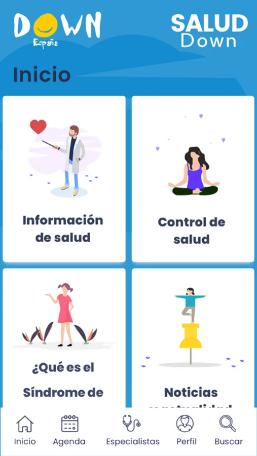 La App Salud Down, dirigida a las personas con síndrome de Down y a sus familias, incluye multitud de funcionalidades con contenido específico relativo a diversos temas de salud.
