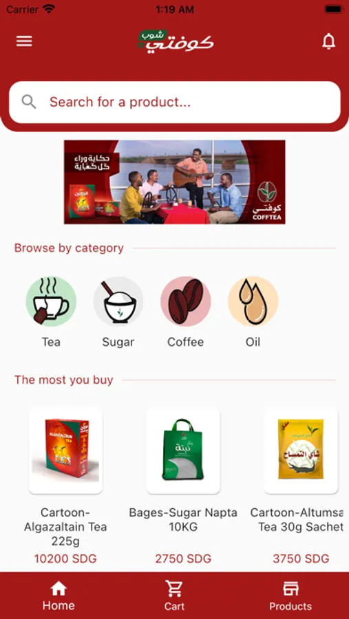 The application displays all Cofftea products and their prices to facilitate the ordering and selection process, in addition to the delivery service through Cofftea's agents.