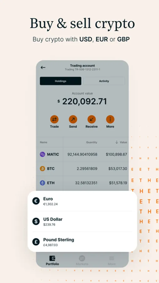 - 20+ digital assets and 3 fiat currencies supported (USD, GBP, EUR)