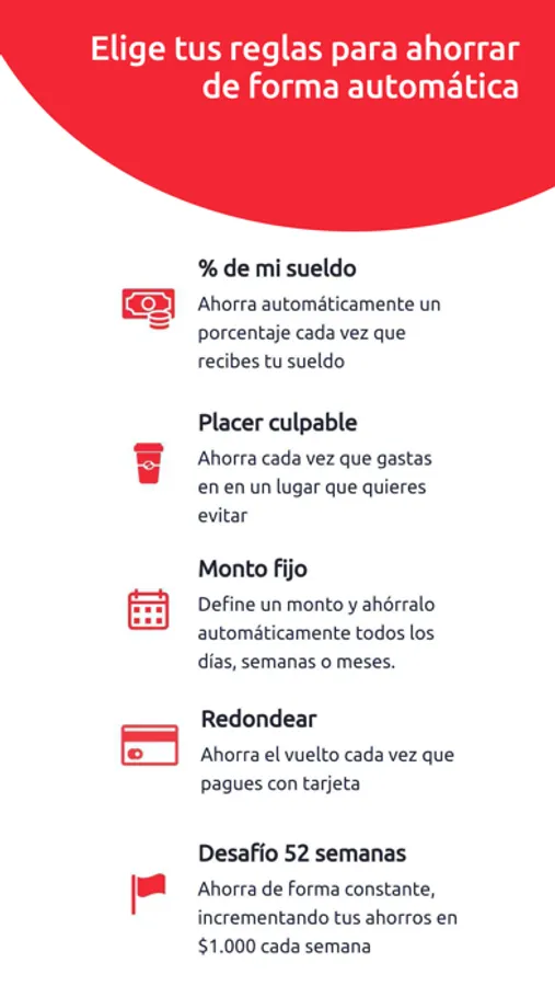 Ahorrar nunca fue tan fácil. Define tus Metas y activa tus Reglas de Ahorro Automático, las que funcionan de manera automática mientras tú sigues con tu día a día. Sin darte cuenta, ¡ya habrás alcanzado tus objetivos!
