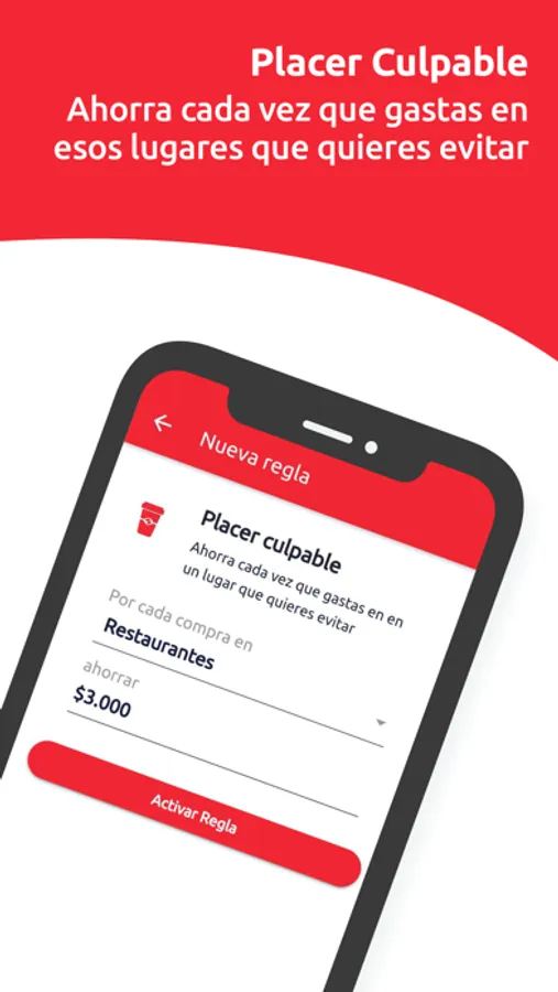 * Gastar menos: define un monto límite y ahorra si gastas menos de ese monto en el día, semana o mes, tú eliges la frecuencia.