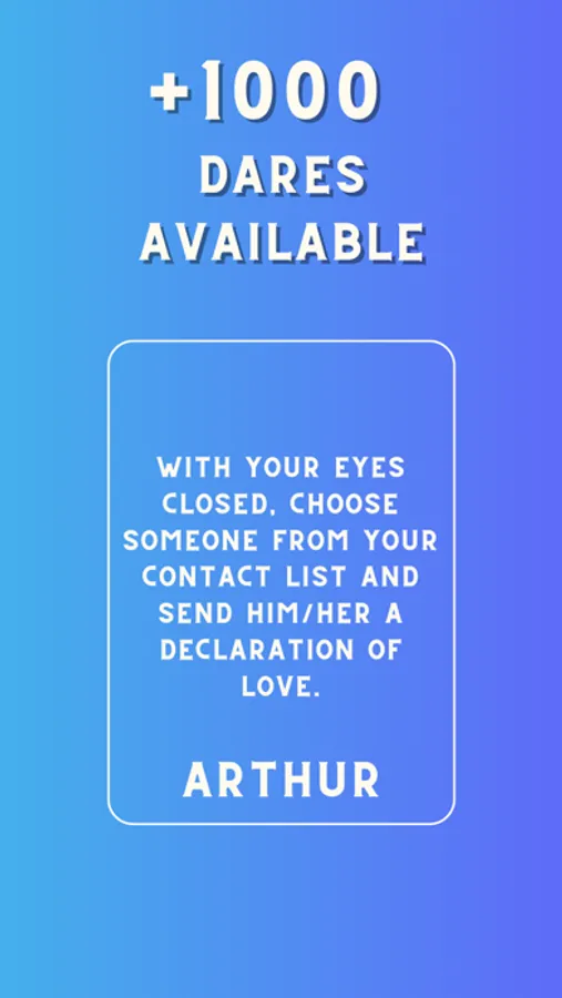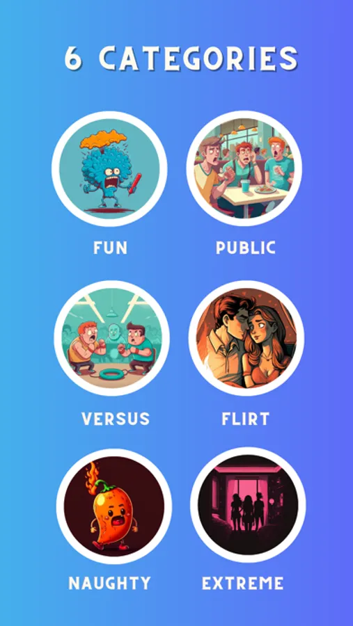 This game will allow you to make any situation fun with your friends. Whether you are out for a walk with the "Public" mode, whether you are in the evening with the "Versus" & "Fun" mode, or whether you are with your crushes with the "Naughty" mode, you can play this game! This game is very popular with student parties, it allows players to better discover themselves, to create a great atmosphere and thus to spend an unforgettable evening.