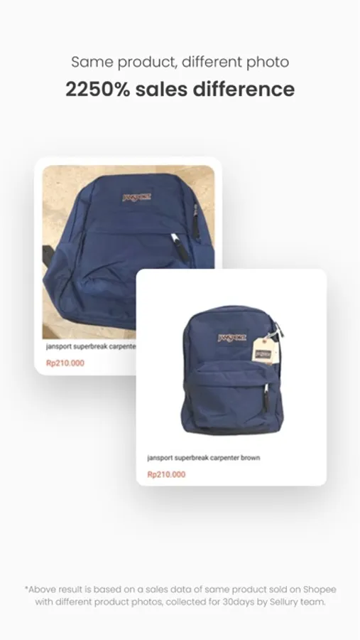 By 30 days selling test under the same conditions such as price and description, between product photo with normal method by SMEs sellers and product photo took & edited with Sellury,