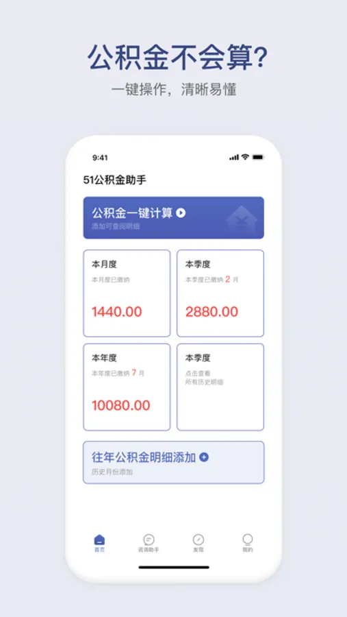 51公积金助手,是一款为对公积金计算、以及记录有需求的用户准备的产品。