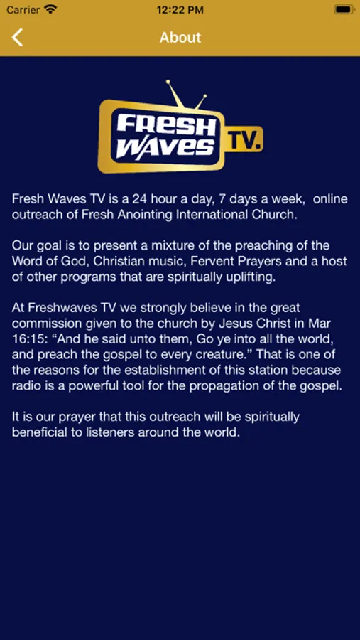 At Freshwaves TV we strongly believe in the great commission given to the church by Jesus Christ in Mar 16:15: “And he said unto them, Go ye into all the world, and preach the gospel to every creature.” That is one of the reasons for the establishment of this station because TV is a powerful tool for the propagation of the gospel.