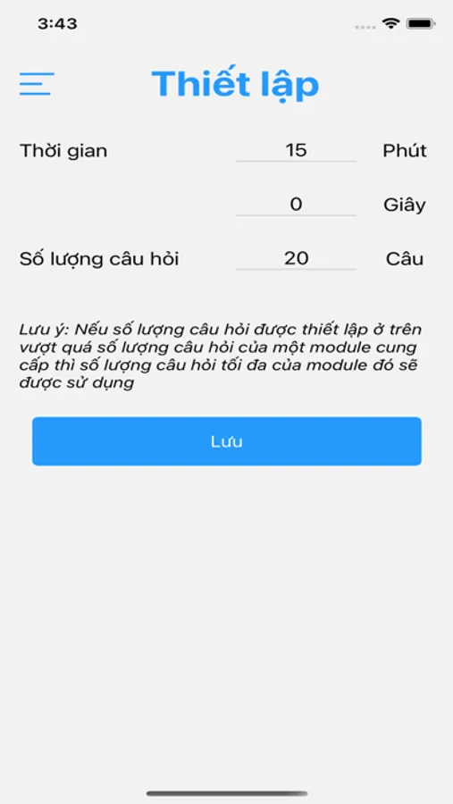 4. Thiết lập thời gian và số lượng câu hỏi của mỗi lần thi.