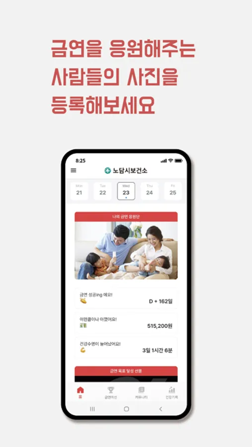 홈 화면에서 금연 응원단과 금연 목표를 정할 수 있습니다.