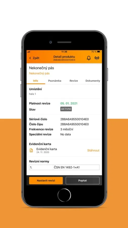 Stažením této aplikace uděláte ze svého telefonu čtečku (všech typů) identifikačních štítků a on-line archiv evidenčních karet v jednom. Telefonem pak načtete štítek vazáku nebo "napípnete" jeho čip a hned na displeji vidíte jeho evidenční kartu. Jeřábník si v ní např. může ověřit povolené nosnosti, revizní technik jedním ťuknutím udělit revizi a automaticky tím vytvořit revizní zprávu. Aplikace též umožnuje správu všech typů povinných revizí a kontrol jeřábů dle platných norem a doporučení AZZ.