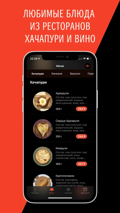 В нашем меню можно найти: салаты, закуски, горячие блюда, десерты и, конечно же, двенадцать видов хачапури!