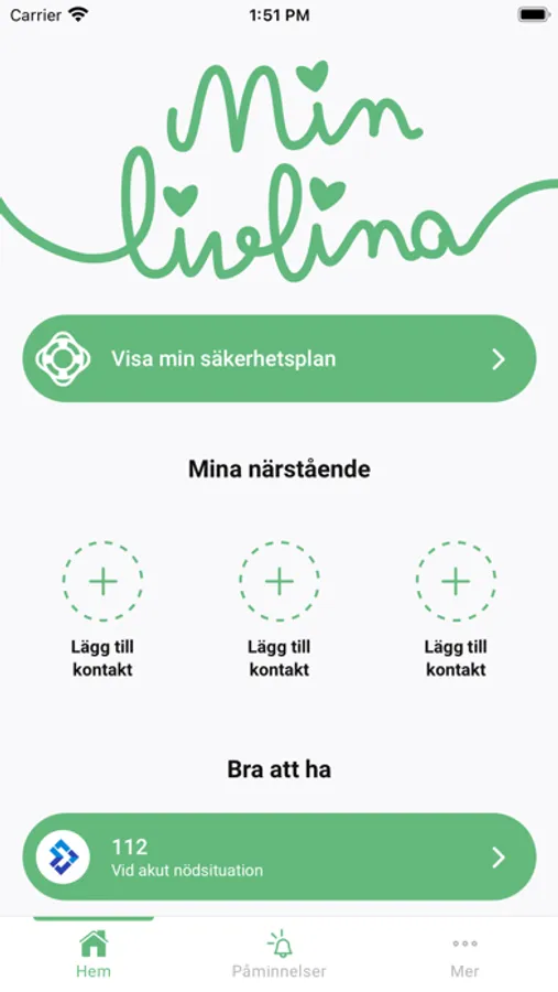 Min Livlina är utvecklad för dig som har kontakt med psykiatrin och som har gjort ett eller flera självmordsförsök. Appen ger dig stöd för hur du tillsammans med en utbildad behandlare inom psykiatrin kan upprätta en säkerhetsplan. Säkerhetsplanen innehåller ett antal personligt anpassade hanteringsstrategier som kan vara till hjälp att förebygga och hantera en möjlig självmordskris. Det är de insikter och strategier som du tillsammans med din behandlare kommer fram till som bildar innehållet i säkerhetsplanen.