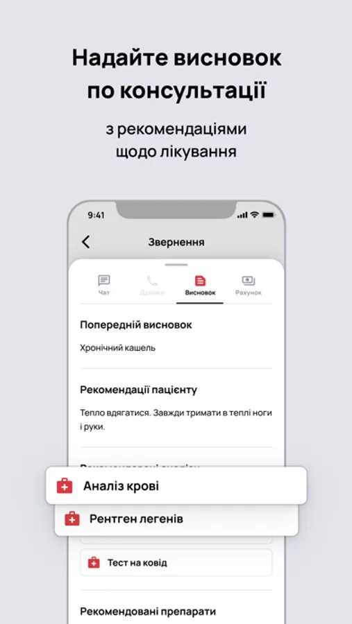 - отримуйте запити на консультацію, проводьте її в режимі чату та обмінюйтеся файлами.