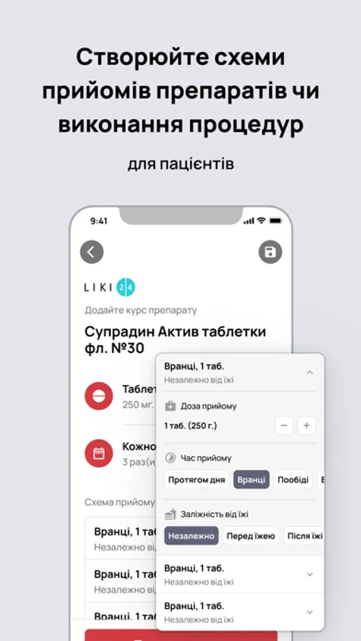 - рекомендації щодо прийому препаратів та додавання детальних схем прийому ліків;