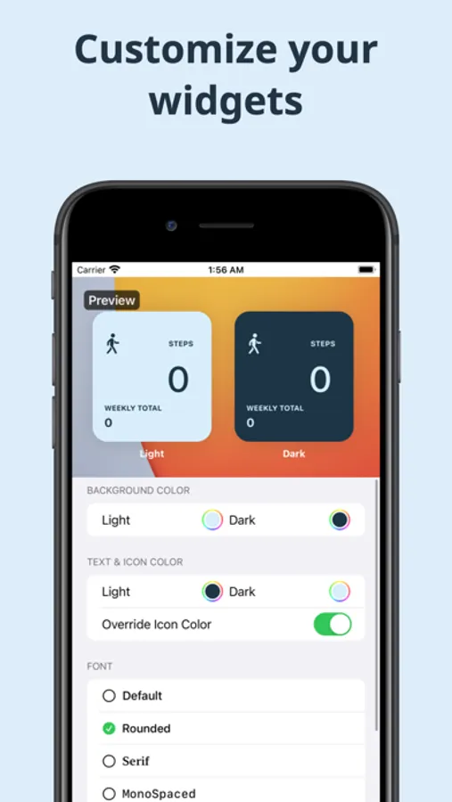 Widghealth also allow you to customize the appearance of your widgets by changing the colors and fonts for both dark and light mode.