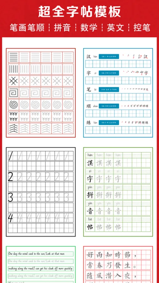 ·多类型字帖模板:汉字、笔顺、拼音、英文、数字、控笔、毛笔字临摹;
