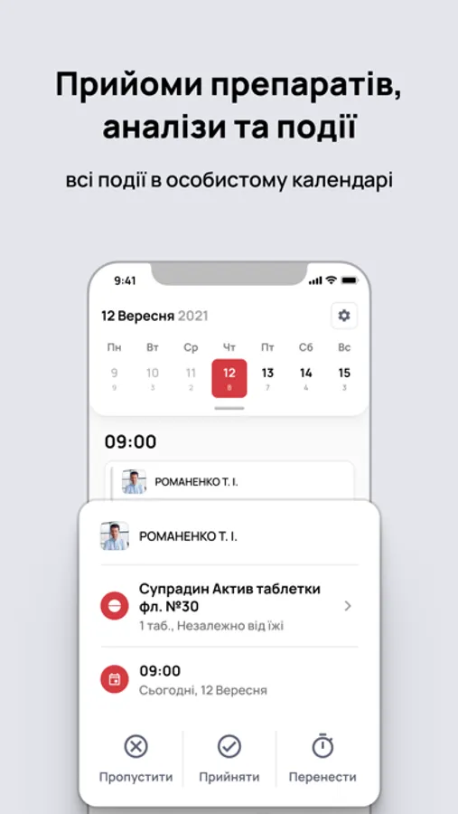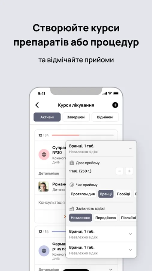 - рекомендації щодо препаратів та схеми прийому - слідкуйте за своїми курсами препаратів, отримуйте нагадування перед кожним прийомом;