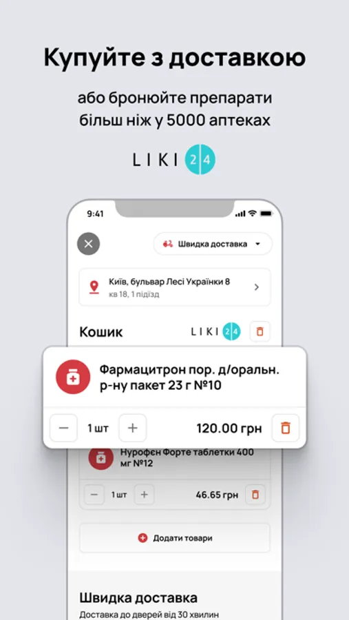 - вибір цін і аналогів препаратів згідно місця розташування користувача або вибір доставки Liki 24.