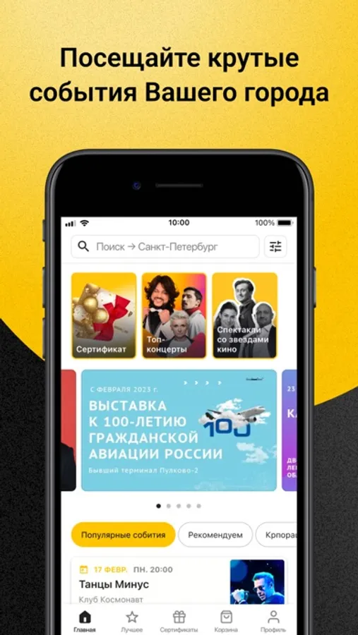 Концерты, мюзиклы, спектакли, драмы и комедии, балеты и оперы, новогодние представления, выставки, фестивали, клубы, матчи – полная интеграция приложения с сайтом Кассир.Ру позволяет получать актуальную информацию по всем интересующим событиям твоего города.