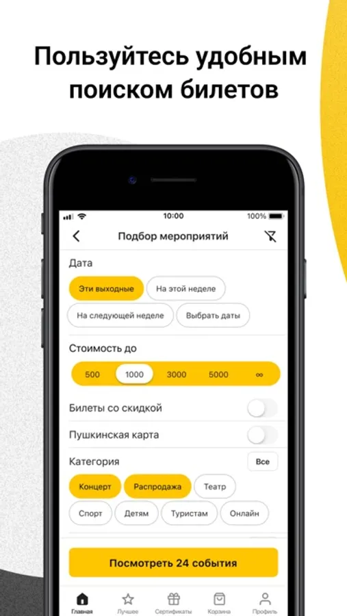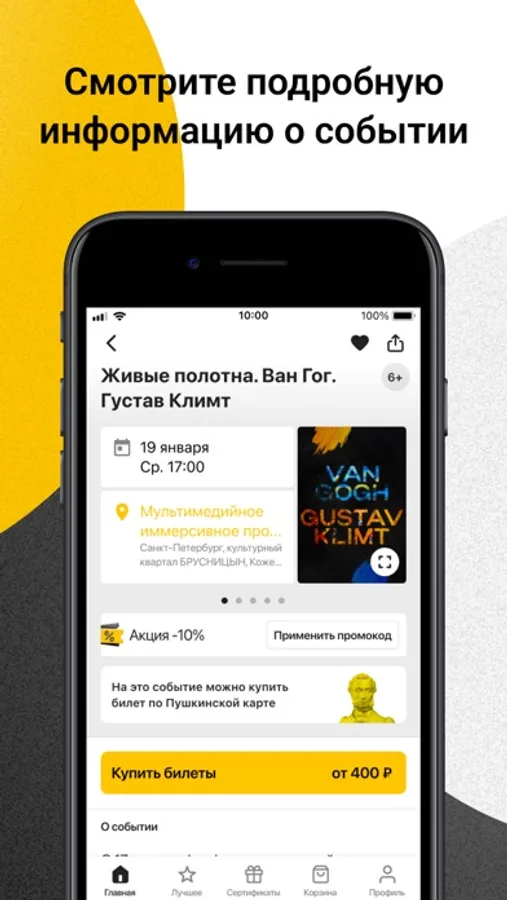 - посмотреть афишу, найти билеты на нужное событие и выбрать дату;