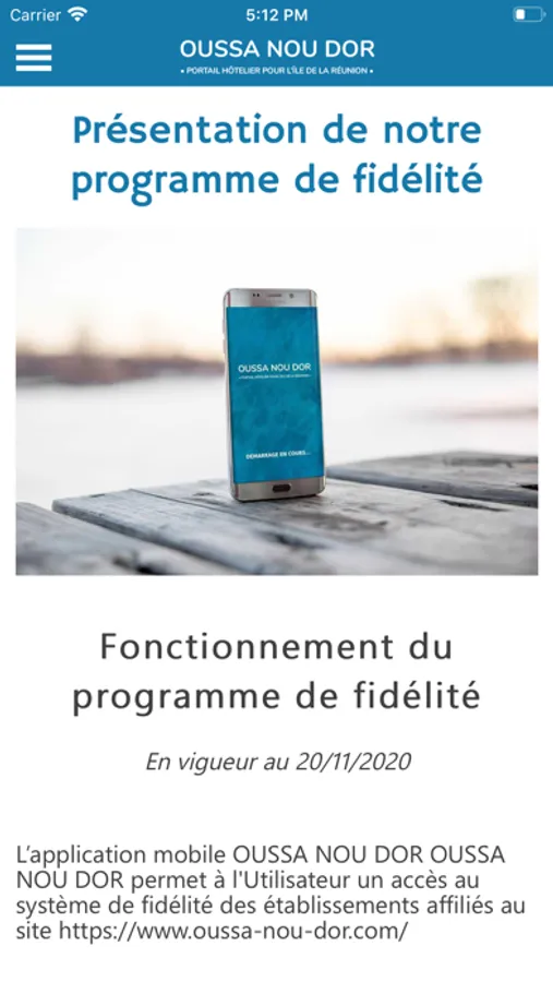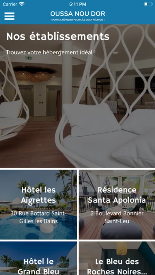 OUSSA NOU DOR est un portail hôtelier qui regroupe aujourd'hui diverses solutions d'hébergements sur l'île de la Réunion. Que ce soit un hôtel 2 ou 3 étoiles, une résidence de tourisme, des locations saisonnières ou un hôtel particulier, nous avons de quoi rendre votre séjour unique et mémorable. Vous trouverez dans cette application mobile, la présentation de tous ces établissements, les coordonnées pour les contacter et réserver en ligne. Vous découvrirez aussi au travers de cette application mobile que nous avons à coeur de chouchouter nos clients, et pour cela nous avons intégré le tout premier programme de fidélité entre établissements hôteliers à la réunion !