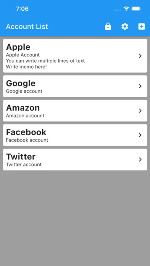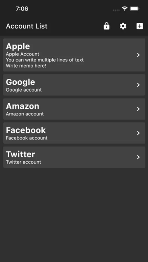 The service names of all the accounts managed by the app and their outlines are displayed in a list. Items in the list can be deleted by swiping left or right, and sorted by long-pressing.