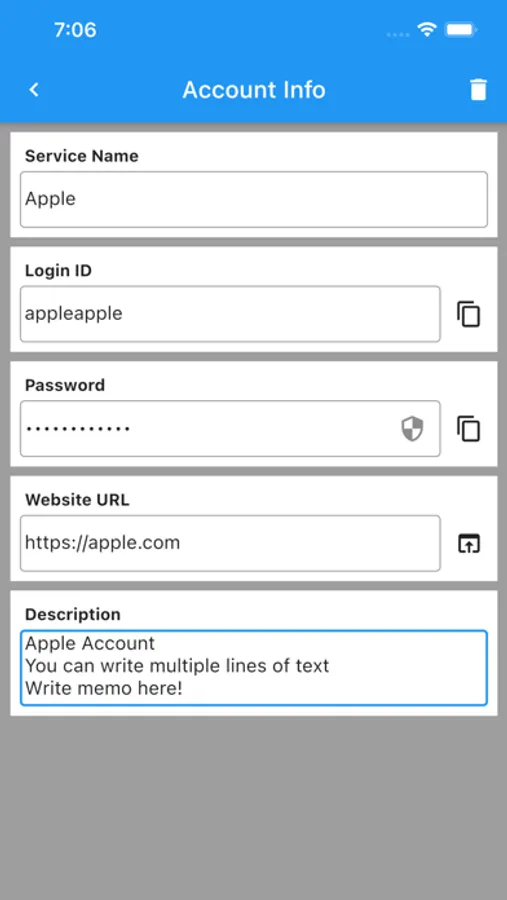 The ID and password can be copied to the clipboard with a single tap, and the password can be switched between hidden and plain text. If you register the URL of the site, you can access it with one tap.