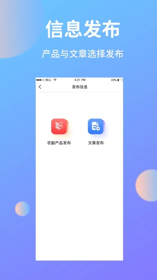 助农帮APP致力于农副产品交易提速、助农信息服务的互享平台,平台分为农副产品供方、农副产品需方和同城批发三种角色,用户可以选择自己所需要的角色发布农副产品信息,可随时随地与农户基地方交流,可实时关注产品类别,实时掌控市场行情,可发布产品文章关注产品情况,平台也是爱心助农平台,优先推荐贫困农户的产品,降低农副产品滞留量和积压不良因素、优先推荐助农方面的文章。愿景:搭建农副产品交易的专业共享信息平台,望农富国更强!