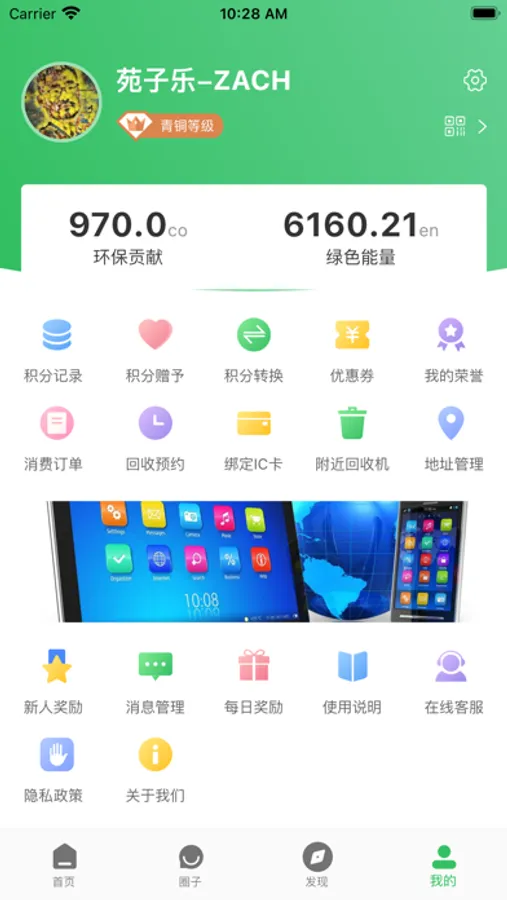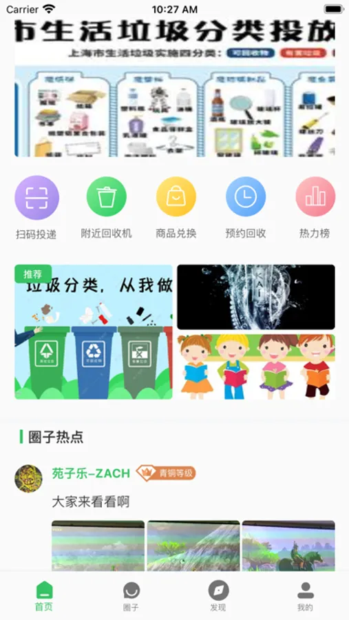 一个多功能的垃圾分类综合使用平台,居民不仅可以进行扫码投递、大件预约、查找附近回收柜、查看小区的投递信息,也可进行在线商品兑换、并且可以通过投递获取优惠券,并且通过微型社区功能促进和宣传垃圾分类,通过签到等多种方式获取更多优惠和奖励。