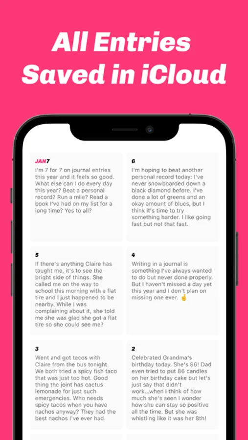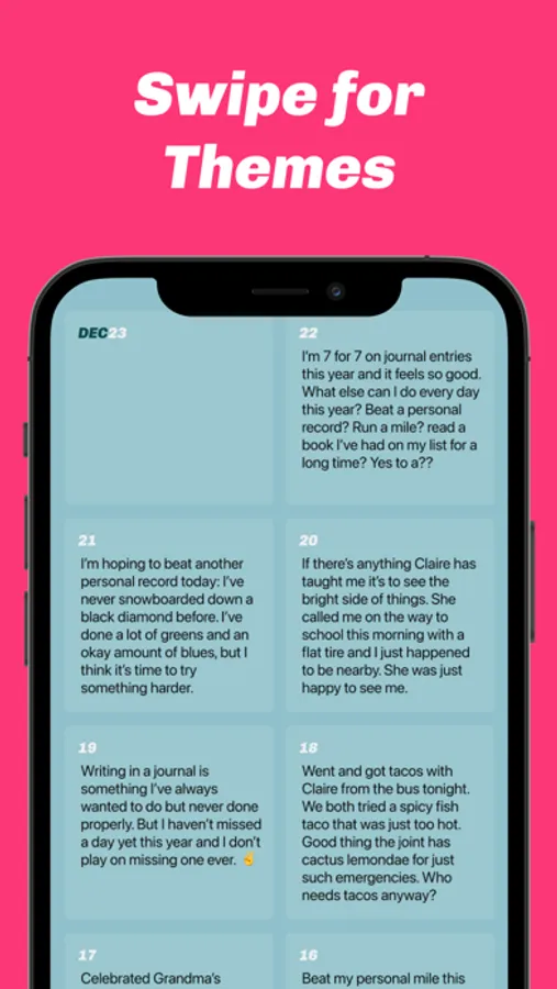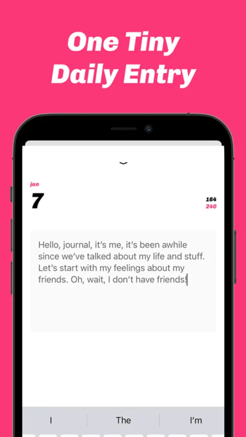 We limit you to one 240-character entry a day. You can't add days you missed. You can't edit yesterday's entries. We need you committed—but just a tiny bit. All entries are saved and encrypted in iCloud for free. Go premium to enjoy lush themes and a daily reminder, with search, export, and more coming soon.
