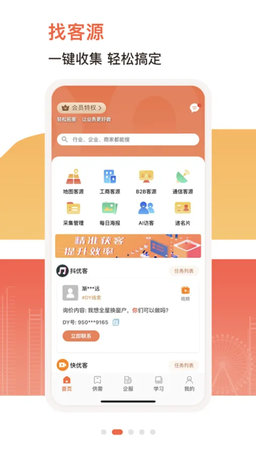 优客易采app拥有dy,ks,企业查询,附近客源,地图客源,平台客源等多项功能,让您更有效精准的获取所需要的客源。