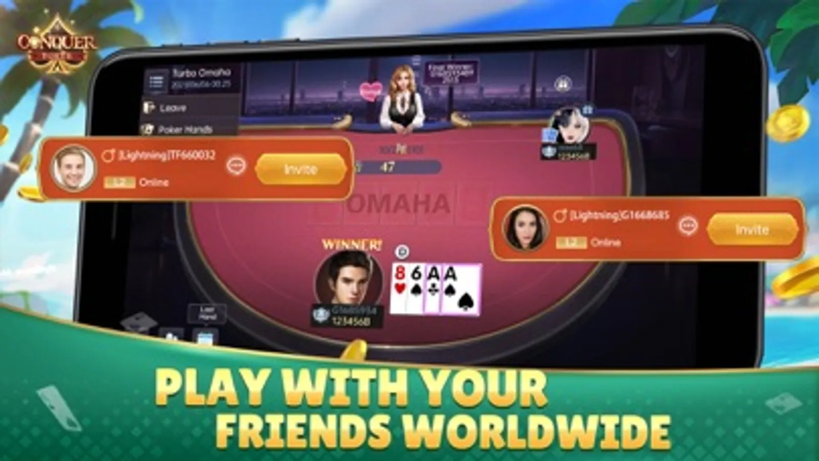 · Cross-Platform - Conquer Poker supports cross-play between PC and mobile seamlessly. One account can serve you well on any platform.