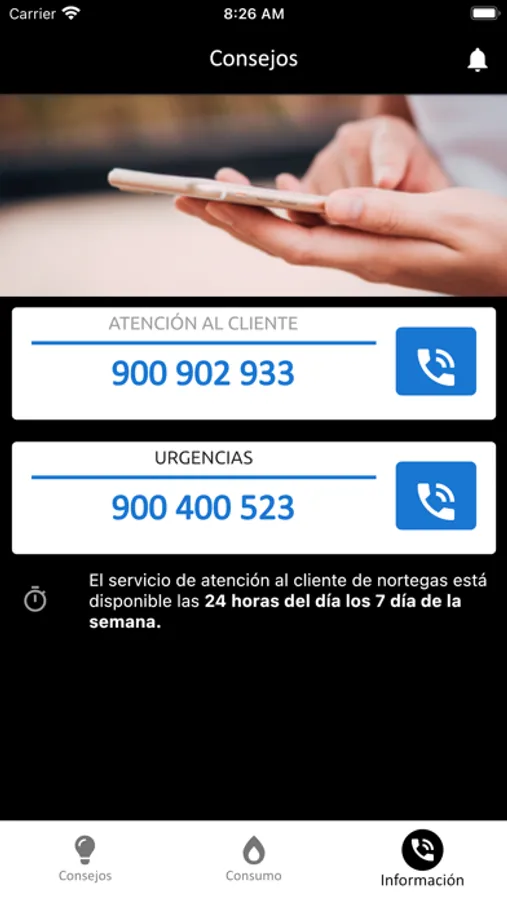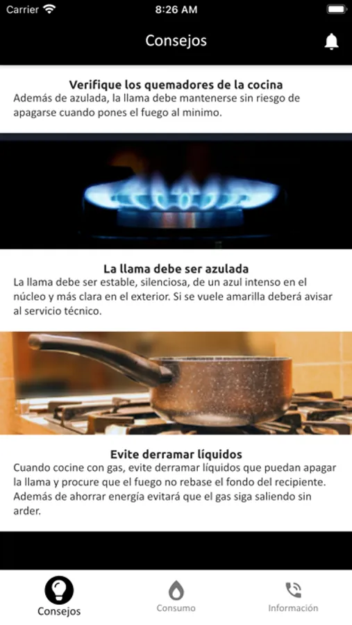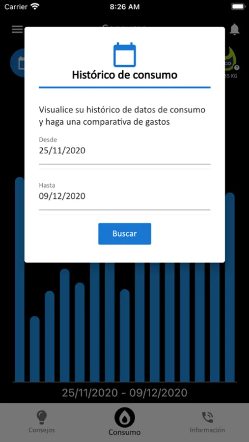Mediante la app, el usuario es capaz de ver y analizar su consumo de gas, pudiendo visualizar diferentes tipos de gráficas. Ademas recibirá notificaciones en caso de cualquier anomalia detectada en su zona o en su propio contador inteligente.