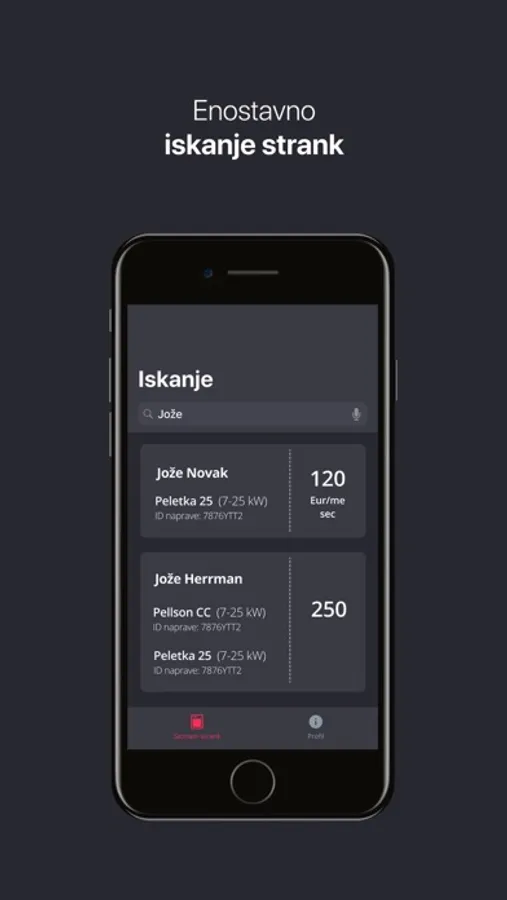 App purpose is searching, finding and defining clients with BioEnergyUnit furnaces. Serviceman can search by name, ID or address to find the right client with furnace.