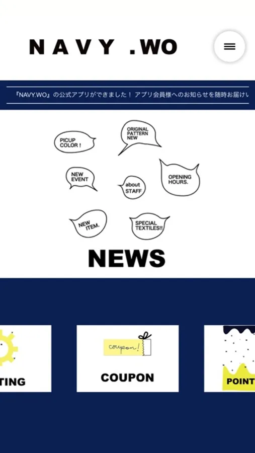 NAVY.WO(ネイビー・ウォ)公式アプリは、Netshopをご利用でき、新作やコレクションのご案内、アプリだけのお得な情報やSHOPの情報をプッシュ通知でお知らせします。