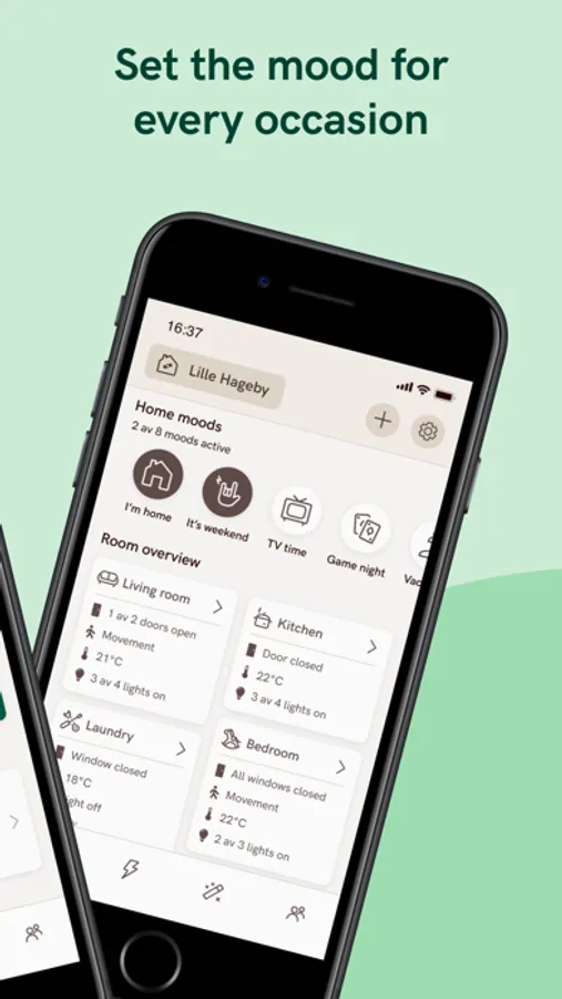 Settings you often use can be saved as "moods" so that you have shortcuts to "Movie night", "Romantic dinner" or "Wake up" for example - or other moods of your choice. Because after a long evening, nothing beats the comfort of crawling under the covers and with one tap, Eva will take care of the rest – turning off the lights and bidding you “Good night!”. Wouldn't you agree?