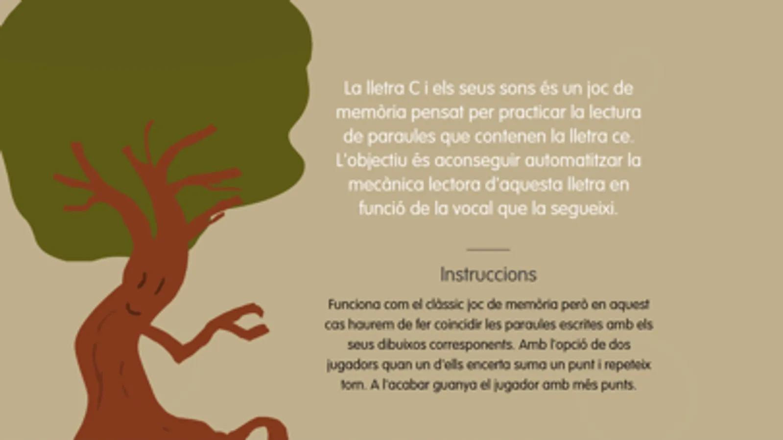 La lletra C i els seus sons és un joc de memòria pensat per practicar la lectura de paraules que contenen la lletra ce. L'objectiu és aconseguir automatitzar la mecànica lectora d'aquesta lletra en funció de la vocal que la segueixi.