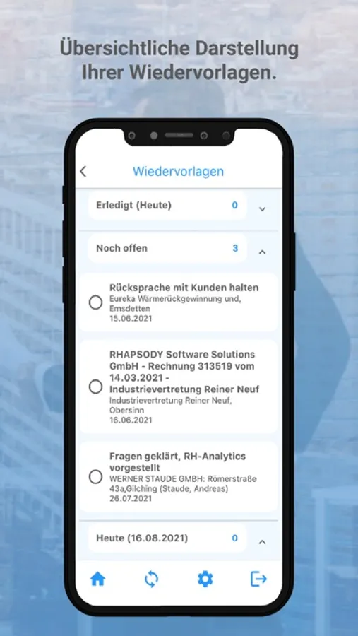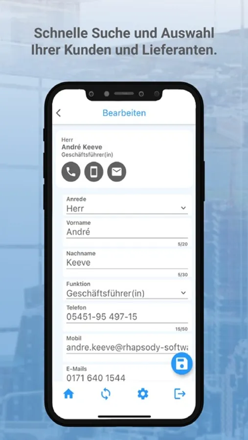 Sie können direkt aus der App telefonieren und hinterlegte Telefonnummern Ihrer Ansprechpartner aus RHAPSODY® nutzen. Legen Sie neue Ansprechpartner an und synchronisieren Sie diese mit RHAPSODY®. Emails können Sie direkt aus der App versenden.