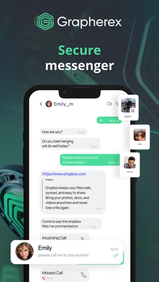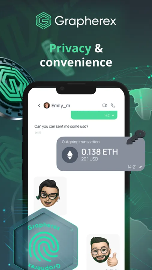 Grapherex is the app with secure messenger, cryptocurrency wallet and many other useful features.