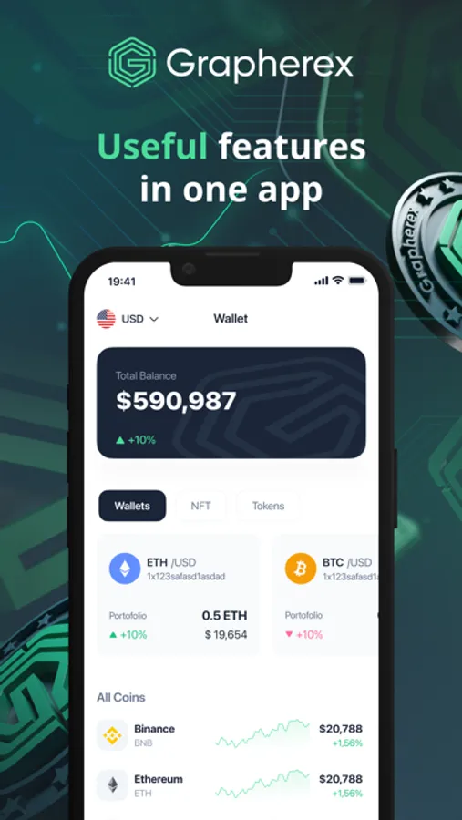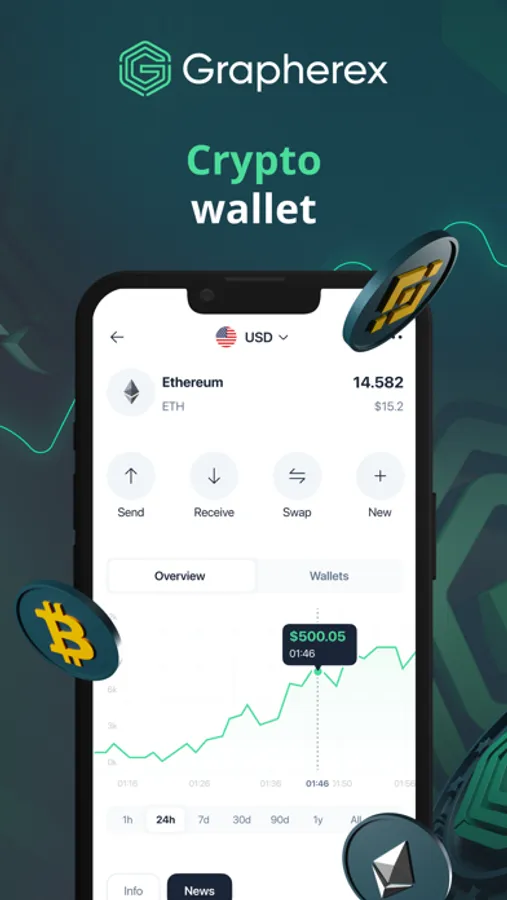 Open a single cryptocurrency wallet to safely store, send and receive crypto currency with Grapherex right on your device. Only you hold the private key and can access your account. Your data and funds are protected by E2E encryption and state-of-art information security technologies.