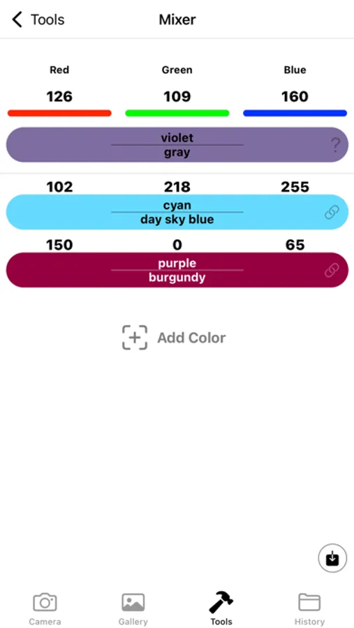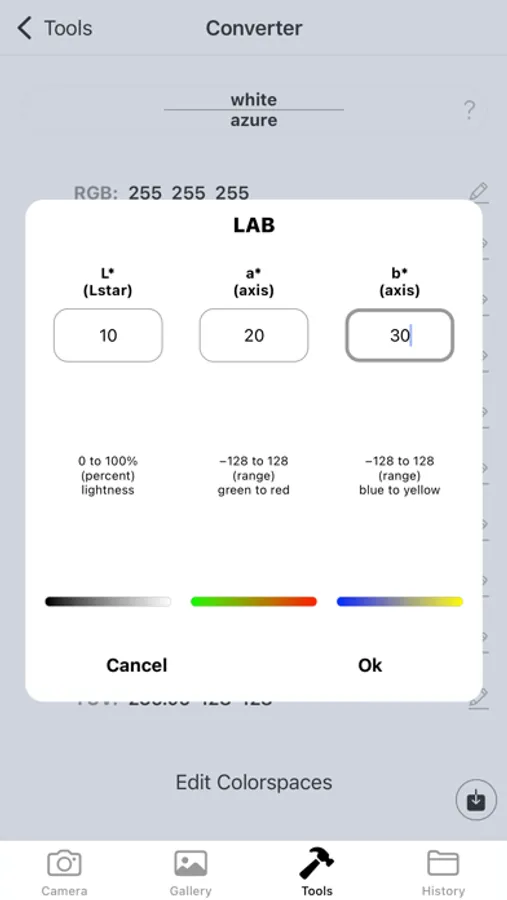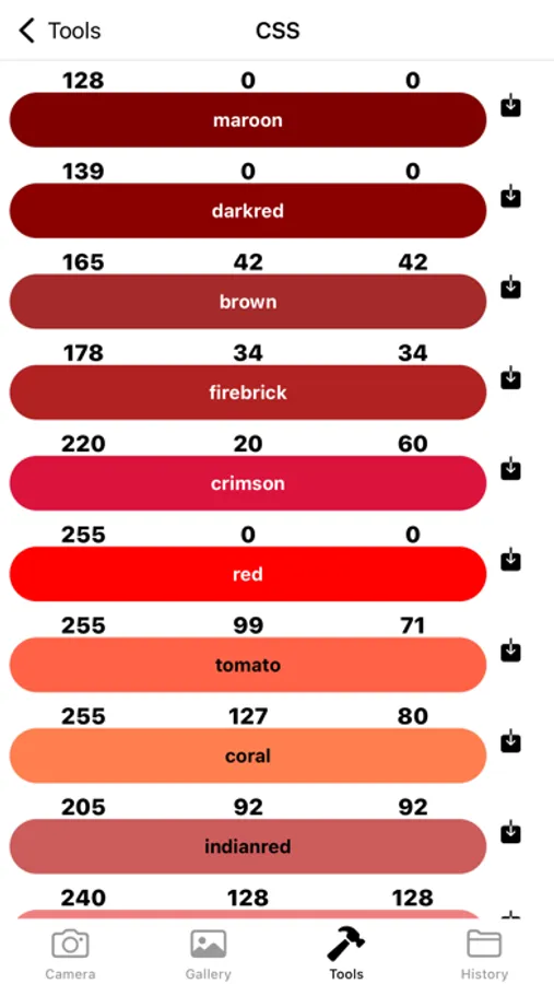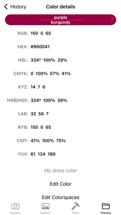Color conversions are possible in formats: RGB, RGB%, RGB 0-1, HEX, CMY, CMYK, XYZ, HSB/HSV, HSL, LAB, WEBSAFE, RYB, YUV.