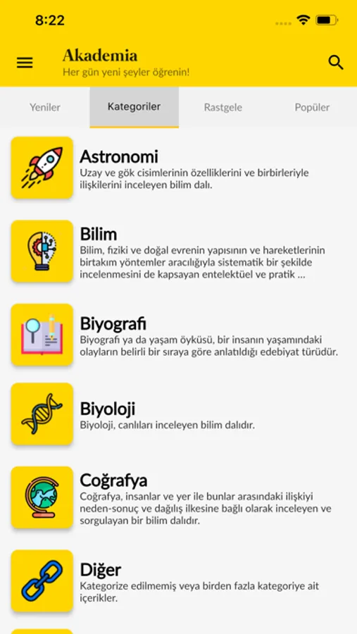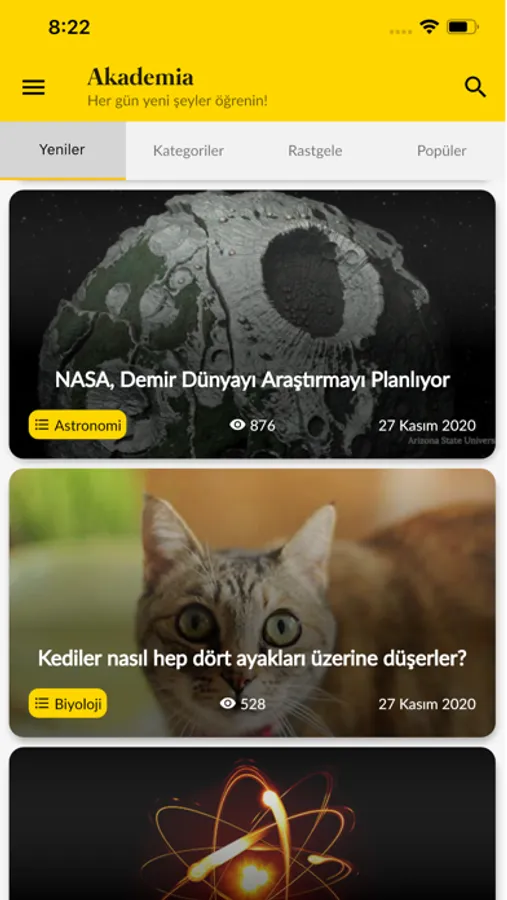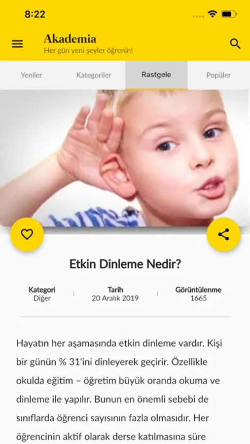 Akademia, mobil uygulamasında isterseniz rastgele seçeneğini kullanarak uygulamadaki herhangi bir makaleyi görüntüleyebilirsiniz. Uygulamanın çeşitli konulardaki makaleleri arasından ekranınıza gelen makale ile farklı bilgiler keşfetmeniz mümkün. Uygulamanın bu bölümüyle hem eğlenceli hem de verimli vakit geçirebilirsiniz.