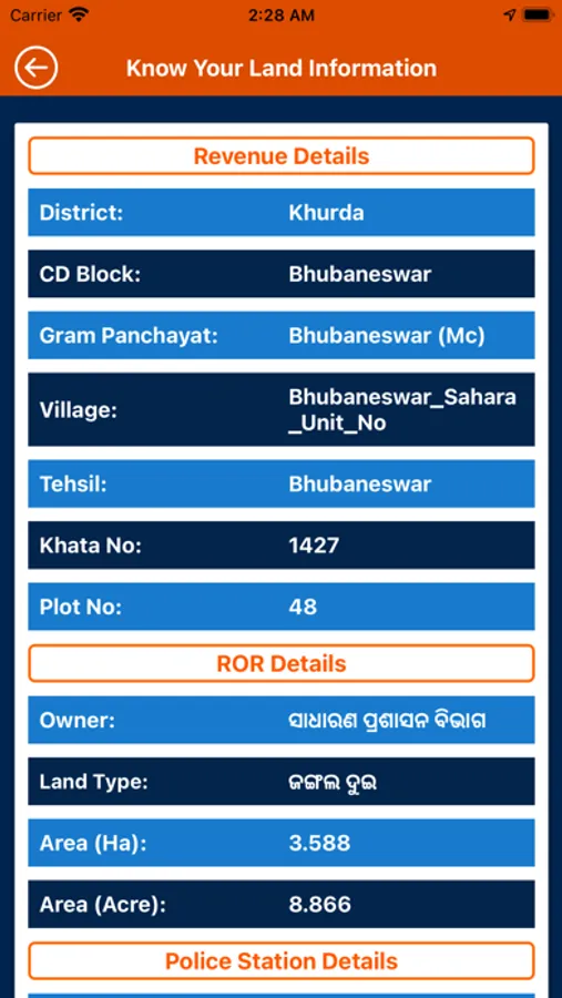 Name, Land Type and Area in Hectare , Police Station Details (Thana Name & Code and