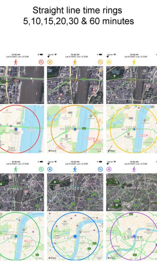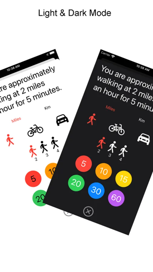 Tap the middle icon to change the modality of transport - walking, cycling/biking or driving. In the pop up menu - tap walking, cycling or driving, set your speed and then how many minutes you want to see.