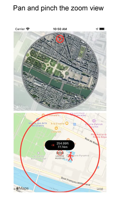 4) Tap the map and see the distance in ft/miles, metres/Km