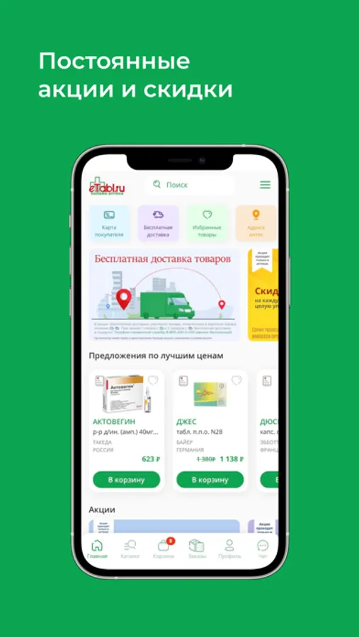 В приложении etabl вы можете по доступным ценам купить лекарства и БАДы, косметику, медицинские изделия, ортопедию, товары категории «оптика» и многое другое. Все это вы можете заказать у нас и забрать в любой удобной для вас аптеке, либо оформить услугу доставки в удобное для вас время.