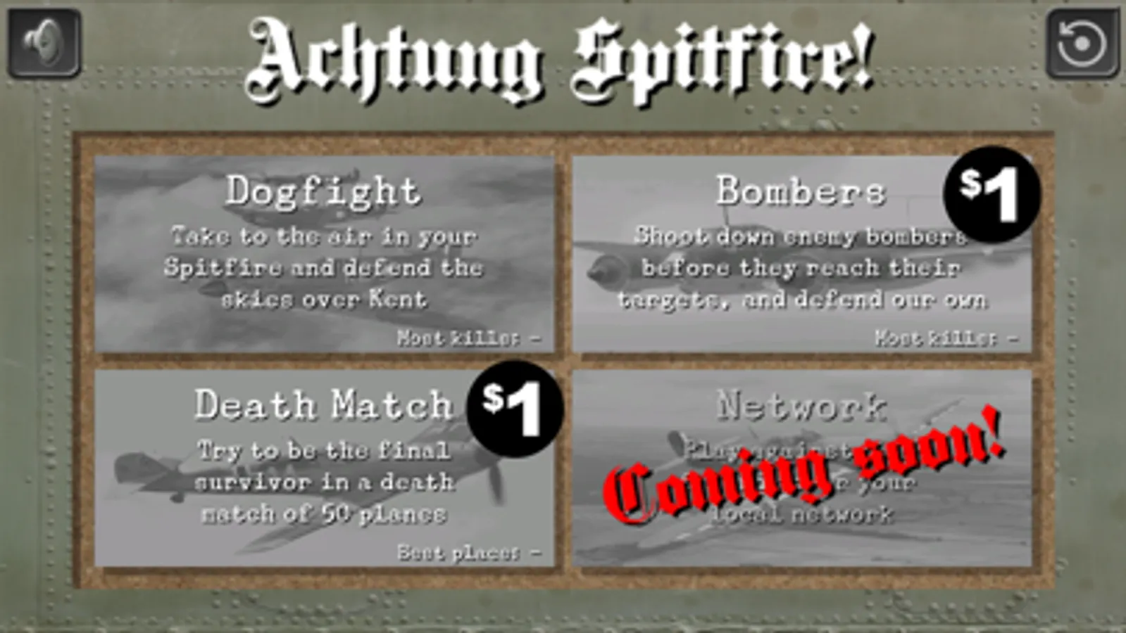 Play either a dogfight against the enemy ME109s, a 50 plane Death Match, or defend your bombers while protecting your own bases from waves of the enemy's bombers.