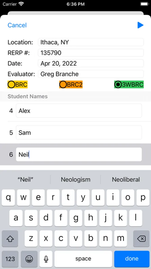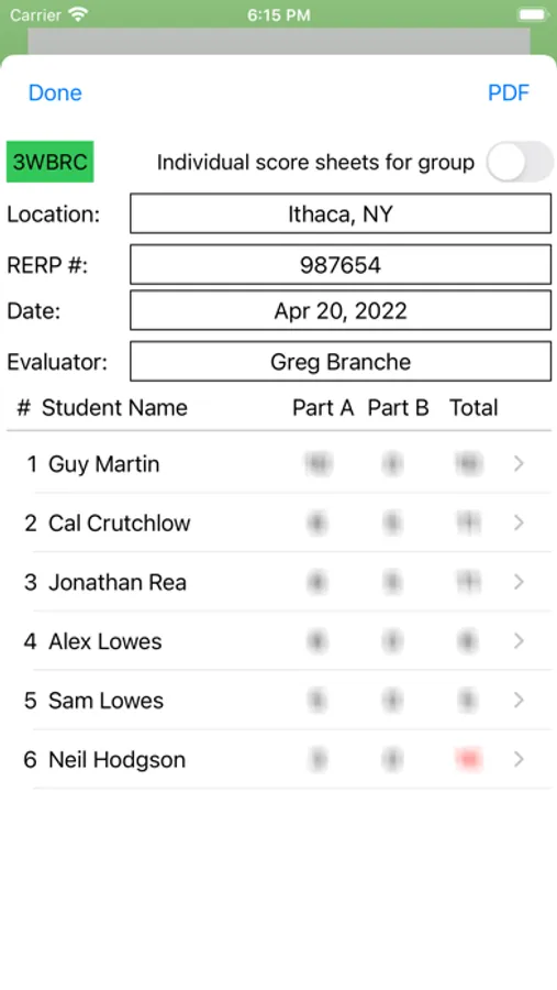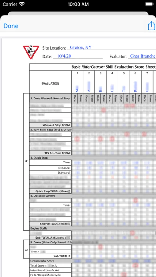 Rather than use the paper score sheet with a clipboard, pencil, and stopwatch, the app allows a certified RiderCoach to score the evaluation completely electronically. Scoring is assessed by tapping controls on the iPhone or iPad screen, with a logical progression of scoring screens provided throughout the evaluation. For evaluations 3, 4, and 5, an on-screen stopwatch is provided, but you are not required to use it – the time can be entered manually if you choose to do so. The Standard Distance for evaluation 3 is calculated automatically. During the skill evaluation, a student’s score is continually updated and displayed on that student’s evaluation page so that the RiderCoach has an immediate view of that student’s status. At the end of the evaluation, each student's score can be reviewed with the student (using an individual score sheet display on screen), and a standard MSF score sheet (individual, or group, or both) can be produced with the necessary annotations. This PDF form can be printed, shared, filed, etc. using standard iOS features.