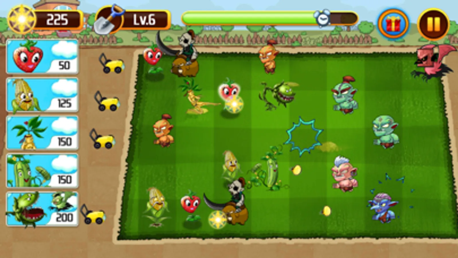 One fine morning, an immense tremor shook the grounds of the Garden Kingdom. The sky turned gloomy. The plants saw a rising tsunami and off came a Goblin Cyclop, pulverizing everything in its way. The war was declared, sirens aloud, the green warriors ready to protect. The Goblin army was something unseen before, covering every inch of sky, land, and water, with the goblin flying bombers, archers, warriors, and goblin riders. The flying goblin was back with the dynamite, which could kill all the plants within seconds. Nonetheless, the sons of the Garden Kingdom, with chlorophyll running in their veins fought with all their might, entangling and the goblins, the pumpkin cannonballs crushed the flying goblins, joined by ginseng, corn, and carnivorous plants in the onslaught. Planting strawberries helped increment the plant power yet remained the question of the dynamite.