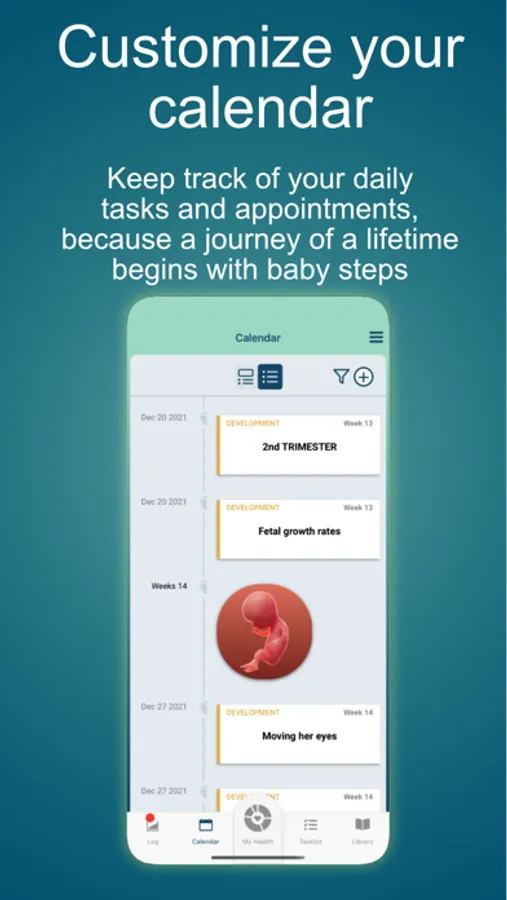 • Interactive Calendar: Track appointments and to-dos. Get weekly updates on your development and baby’s health.