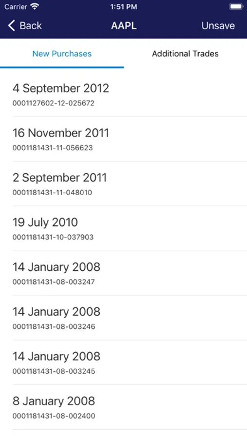 Search for publicly-available company or individual records of new stock trades and additional stock purchases