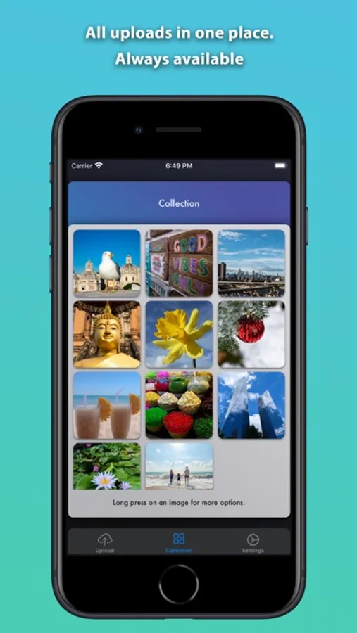 • Upload images and screenshots directly from other apps which support sharing images.